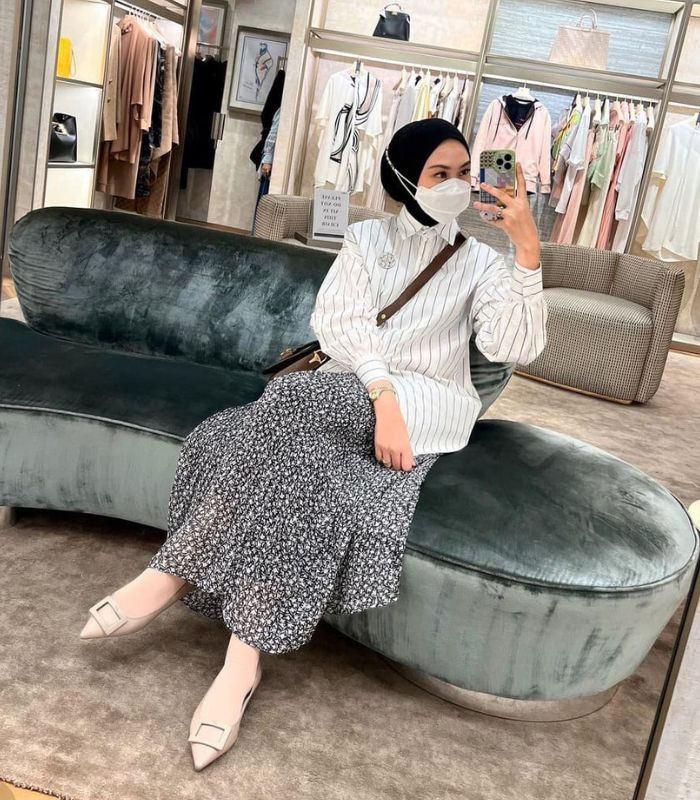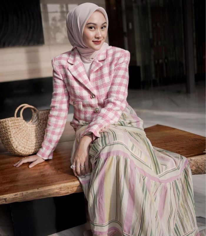 8. Perpaduan inner putih dibalut outer motif plaid dengan A-line skirt motif stripe serta hijab segi empat berwarna pink pastel, bikin penampilannya jadi lebih cheerful dan anggun.