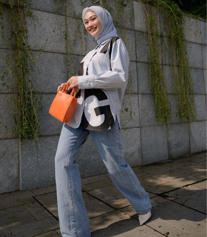 6. Tampil dengan gaya casual dengan memadukan kemeja biru pastel bermotif abjad dipadankan dengan celana jeans serta hijab segi empat berwarna biru muda, kenakan hand bag orange dan heels putih, bikin penampilan jadi lebih stand out!