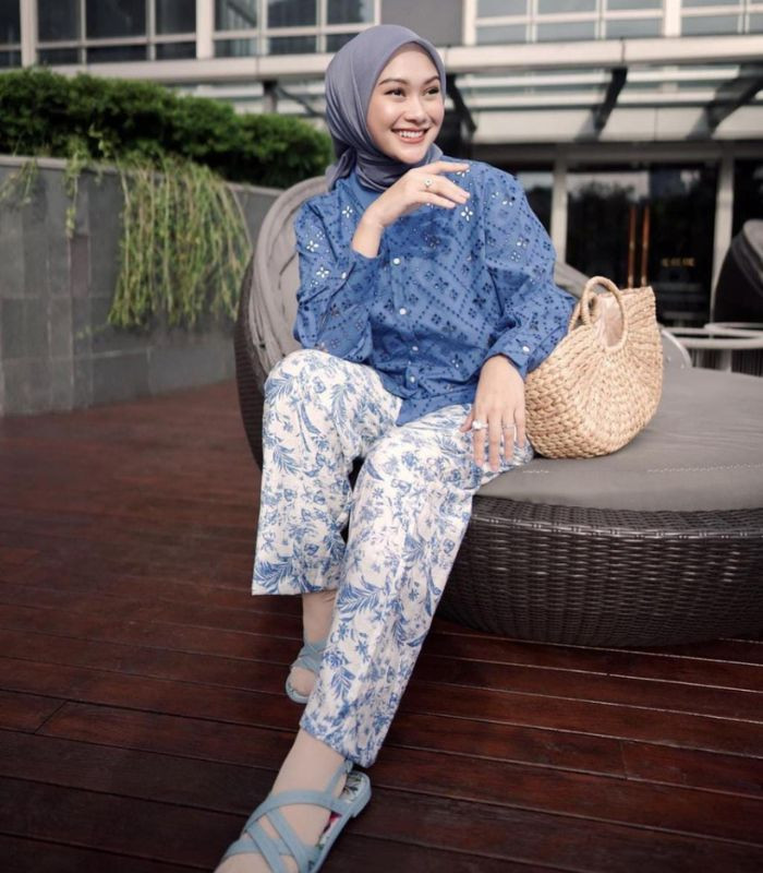 7. Outfit tabrak motif tetap terlihat matching dengan tone warna yang senada, padukan kemeja biru dan high waist pants bermotif dengan hijab segi empat berwarna abu-abu, bikin look-nya makin kece abis!