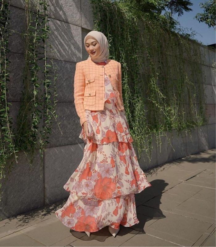 9. Outfit satu ini memberikan kesan feminin look yang memukau! Gunakan outer crop pattern berwarna pink salem dengan inner dress ruffle bermotif floral, serta hijab segi empat berwarna soft beige, jadi terlihat adem dilihat!