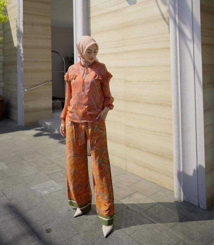 10. Memadukan dua warna earth tone berupa blouse warna dark coral bermotif dan celana kulot warna orange bermotif batik dipadankan dengan hijab segi empat warna beige, bikin penampilan jadi lebih all out.
