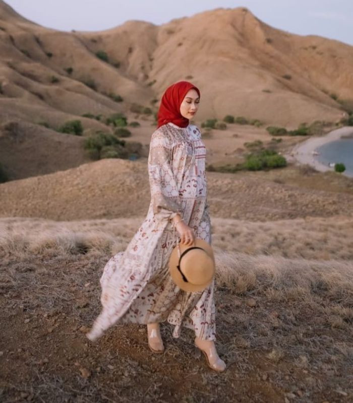 11. Ketika travelling di tempat yang eksotis, menggunakan dress pattern dengan hijab berwarna merah dan strap heel, bikin penampilan jadi lebih kelihatan memesona!