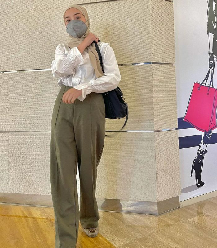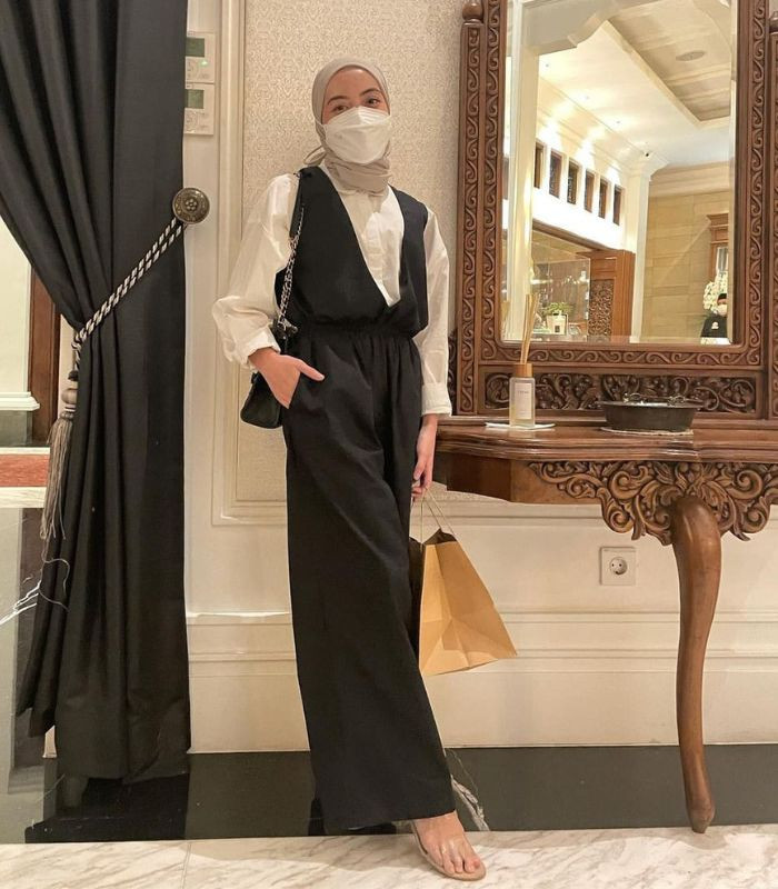 6. Gunakan kemeja putih dibalut jumpsuit hitam dipadukan dengan hijab pashmina berwarna soft beige, kenakan sling bag dan block heels andalan, bikin penampilan jadi lebih elegan.