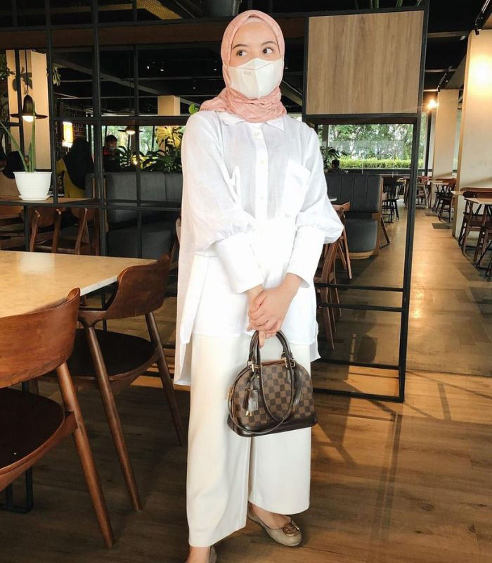 7. White on white yang tampak anggun. Memadukan oversized shirt dan cullote pants berwarna putih senada dipadankan dengan memilih hijab segi empat pink bermotif, kenakan hand bag dan flat shoes berwarna senada agar penampilan makin stand out!