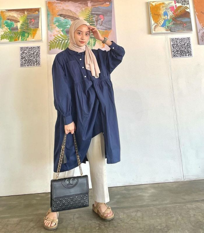 8. Outfit yang memberikan kesan modis minimalis dengan tampilan memukau. Padukan oversized tunik warna navy dengan straight pants warna beige serta hijab pashmina berwarna soft beige. Kenakan hand bag dan strap sandals andalan, ya!