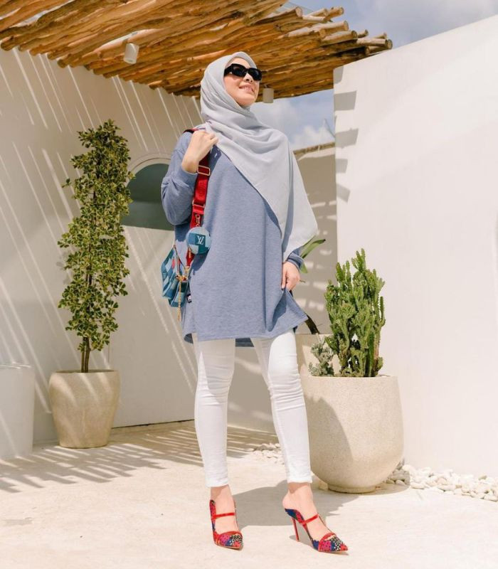 1. Perpaduan tunik sleeve t-shirt berwarna denim dengan hijab segi empat warna light grey serta straight pants putih, kenakan shoulder bag dan high heels berwarna terang untuk mengimbangi outfit bernuansa kalem ini.