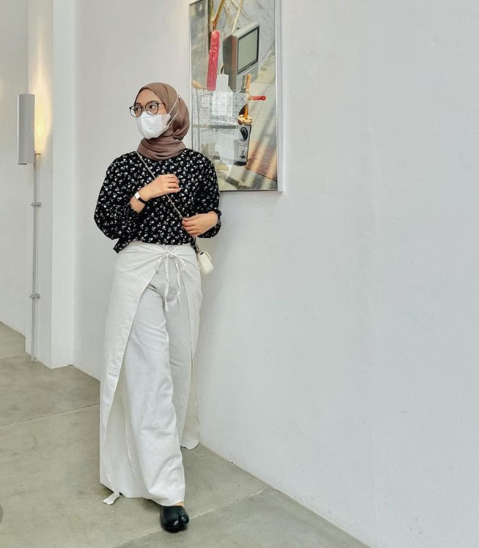 1. Perpaduan blouse pattern floral warna hitam dengan wrap pants cream dipadankan dengan hijab pashmina berwarna coklat, kenakan sling bag dan strap sandals, bikin look-mu tampil stylish nan kekinian!