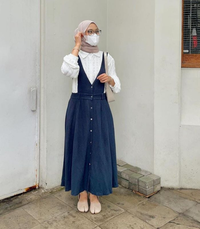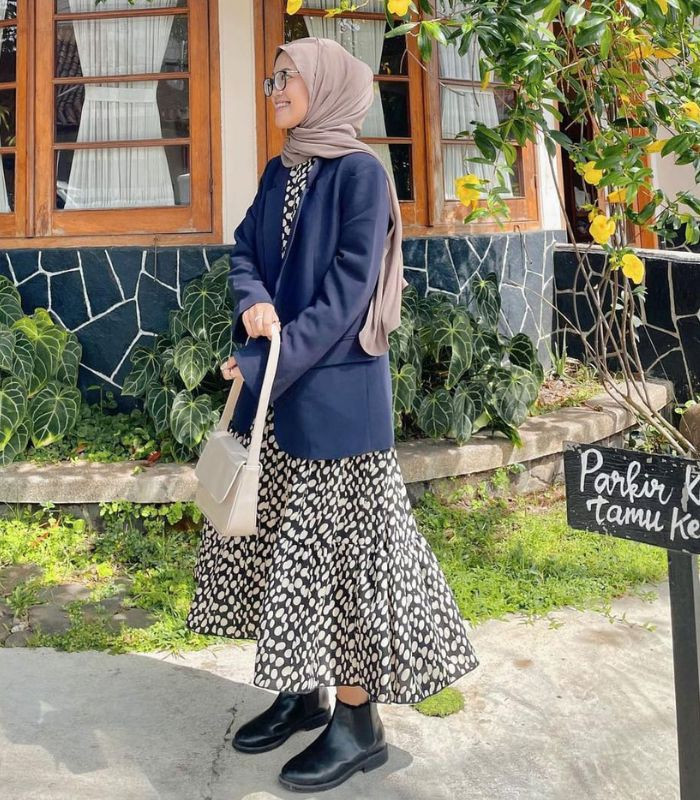 5. Gunakan long dress motif polkadot dibalut oversized blazer warna navy serta hijab pashmina berwarna latte. Tambahkan hand bag nude dan sepatu boots hitam agar lebih elegan!