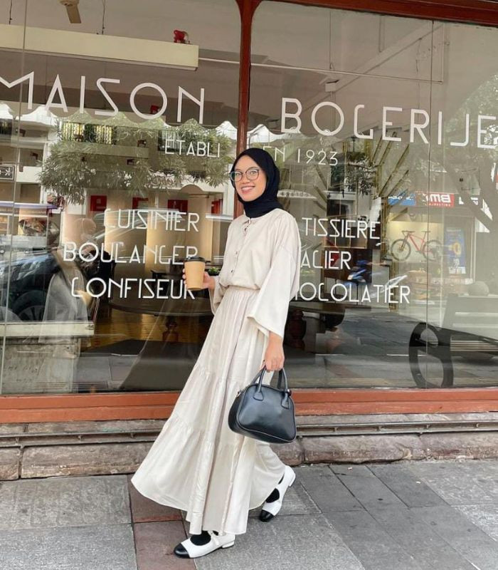 3. Penampilan dengan tema nude kalem yang manis. Gunakan setelan kemeja dengan ruffle skirt berwarna ivory nude yang senada, dipadukan dengan hijab pashmina yang serasi dengan hand bag, serta gunakan ballet flats shoes berwarna putih.