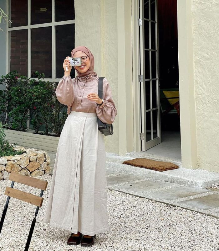 4. Terkesan modis yang telihat elegan. Padukan silky blouse berwarna tan dengan wrap skirt berwarna broken white serta hijab pashmina warna coklat yang tampak matching, kenakan hand bag dan flat shoes berwarna hitam senada.