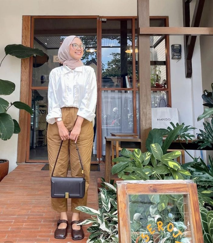 6. Terkesan casual yang terlihat nyaman dikenakan seharian. Padukan silk shirt putih dengan baggy pants berwarna coklat serta pilih hijab pashmina berwarna pink pastel, tambahkan hand bag dan sepatu andalanmu, ya!