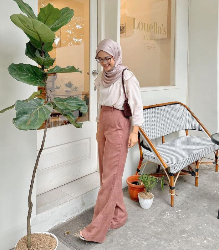 7. Penampilan yang memberikan kesan feminin look yang tampil stylish. Kombinasikan blouse berwarna pink pastel dengan high waist loose pants berwarna pink coral serta pilih hijab pashmina satin warna light pink.