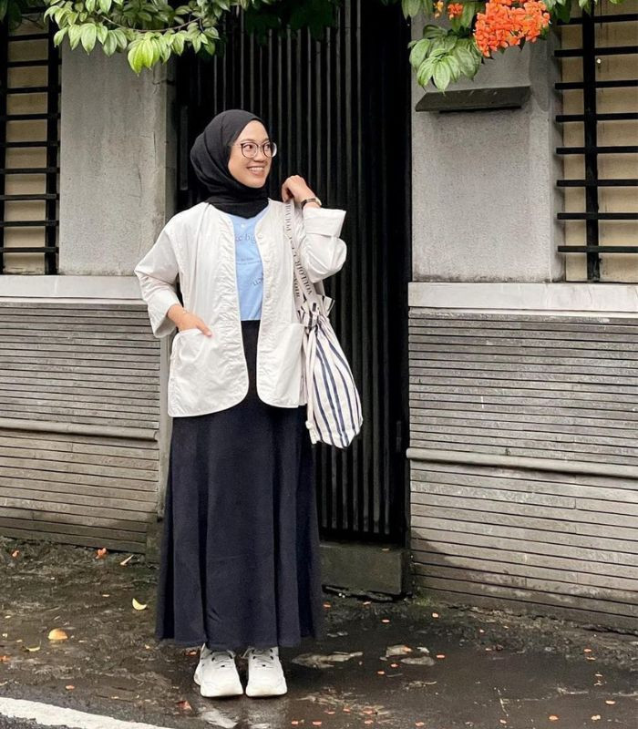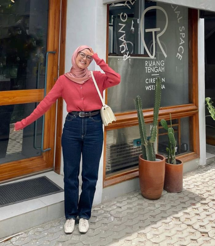 9. Tampil dengan bertemakan cheerful yang terkesan manis. Perpaduan knit cardigan berwarna pink coral dengan straight jeans serta hijab pashmina berwarna dusty pink, tambahkan shoulder bag dan sneakers warna broken white yang senada.