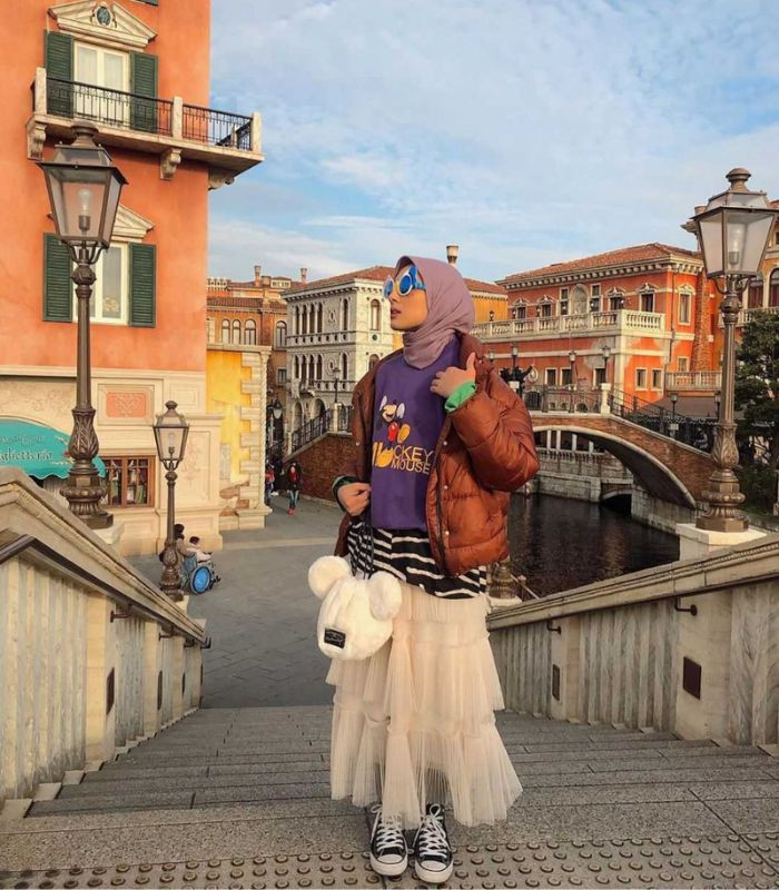 7. Penampilan satu ini memberikan kesan anggun dan stylish! Memadukan kaus berwarna ungu dilapisi jaket warna coklat dipadankan dengan rok tutu putih serta hijab segi empat berwarna soft purple, tambahkan warrior shoes agar tampilan makin kece abis!