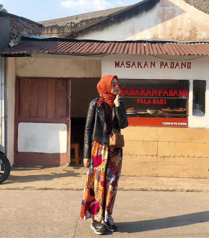 8. Tampilan yang memberikan kesan atraktif dengan memadukan inner hitam dibalut crop top leather jacket berwarna senada dipadankan dengan hijab segi empat warna oranye serta celana kulot bermotif dengan full color ala Bella ini, bikin penampilan jadi makin stand out!
