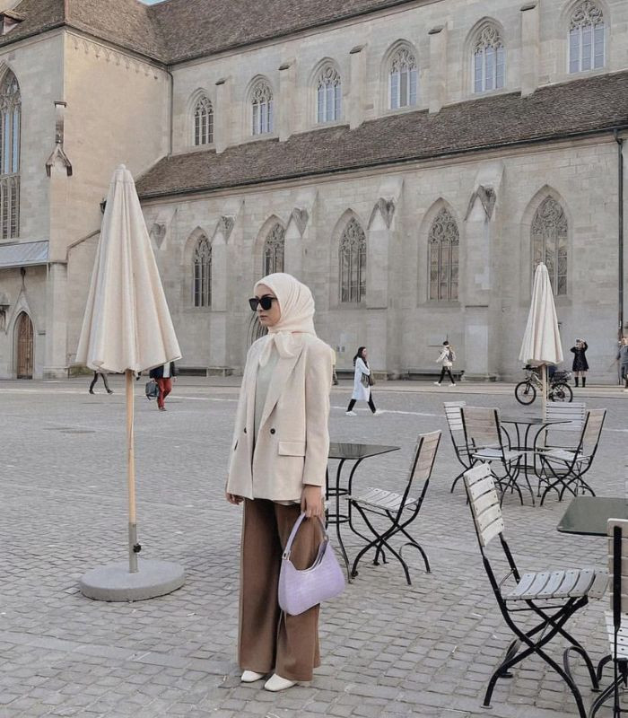 6. Penampilan yang terkesan elegan dengan nuansa warna earth tone yang manis, Bella memadukan inner long sleeve t-shirt warna krem dibalut blazer warna ivory serta high waist wide leg pants berwarna coklat serta hijab segi empat berwarna broken white. Berikan statement point pada outfit dengan menggunakan sunglasses dan chelsea boots putih.