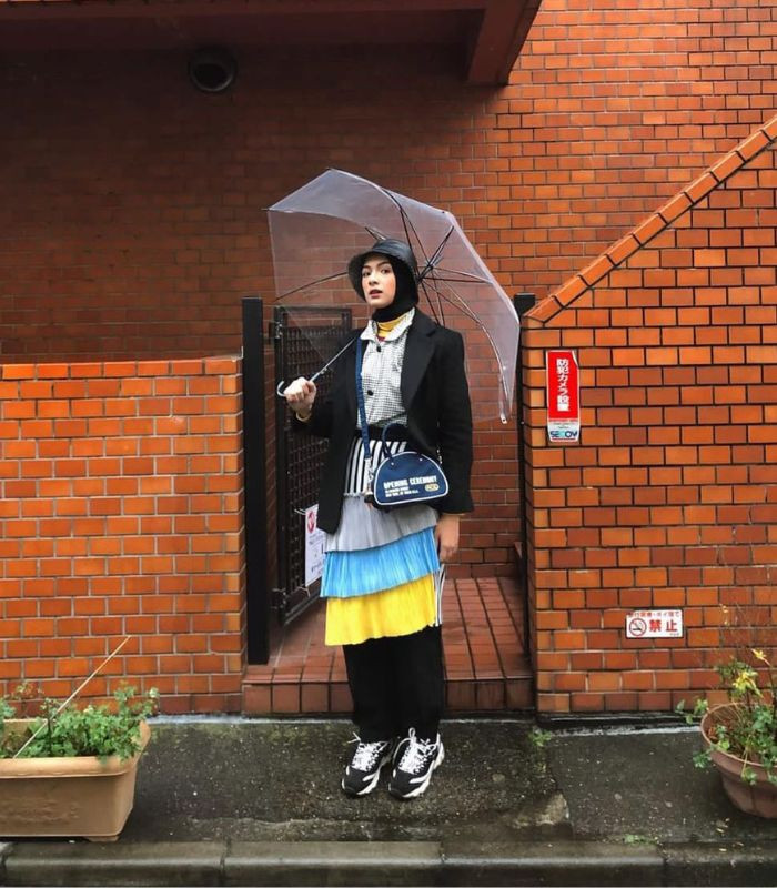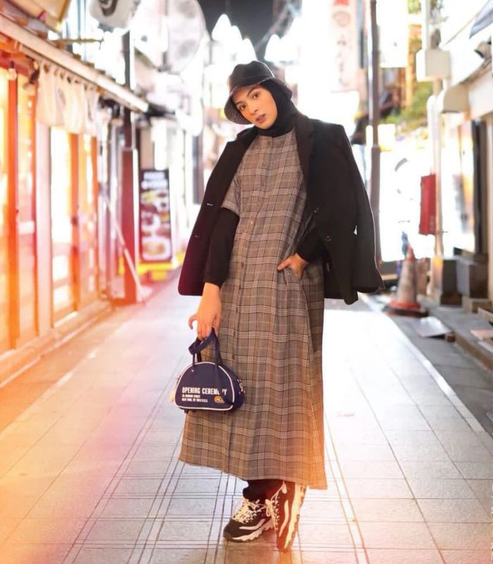 11. Terakhir, perpaduan tunik motif plaid dilapisi blazer warna hitam dijadikan sebagai outer dipadankan straight pants hitam yang senada dengan hijab pashmina, tambahkan bucket hat, hand bag dan juga sneakers berwarna hitam senada. Bikin tampilan jadi makin stylish abis, nih!