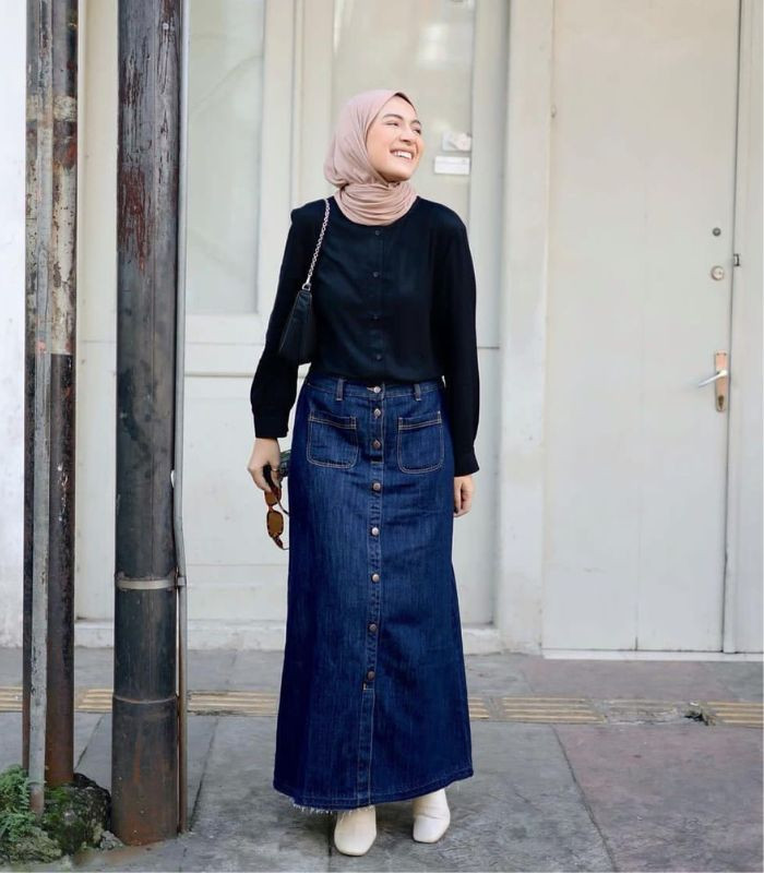 10. Outfit simple namun terkesan anggun yang menawan. Memadukan kemeja hitam dengan button long denim skirt dipadankan dengan hijab pashmina berwarna dusty pink, tambahkan chelsea boot putih biar makin terlihat kece abis!