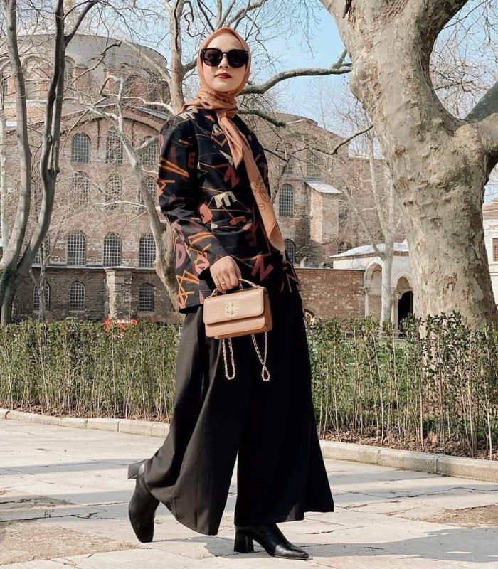 9. Tampil elegan yang memberikan kesan preppy chic. Padukan blazer bermotif abjad dengan celana kulot hitam yang senada dengan chelsea boots dipadankan dengan hijab segi empat warna coklat. Bikin penampilan jadi makin stylish dengan menggunakan sunglasses dan hand bag andalan.