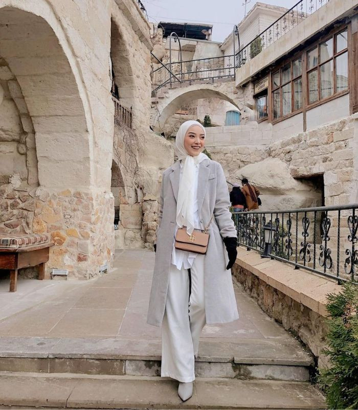 10. Terakhir, Intan menggabungkan kemeja lengan panjang, high waist pants serta hijab segi empat berwarna serba putih dibalut dengan long blazer warna light grey, tak lupa ia kenakan chelsea boots putih sebagai statement point pada outfit-nya.
