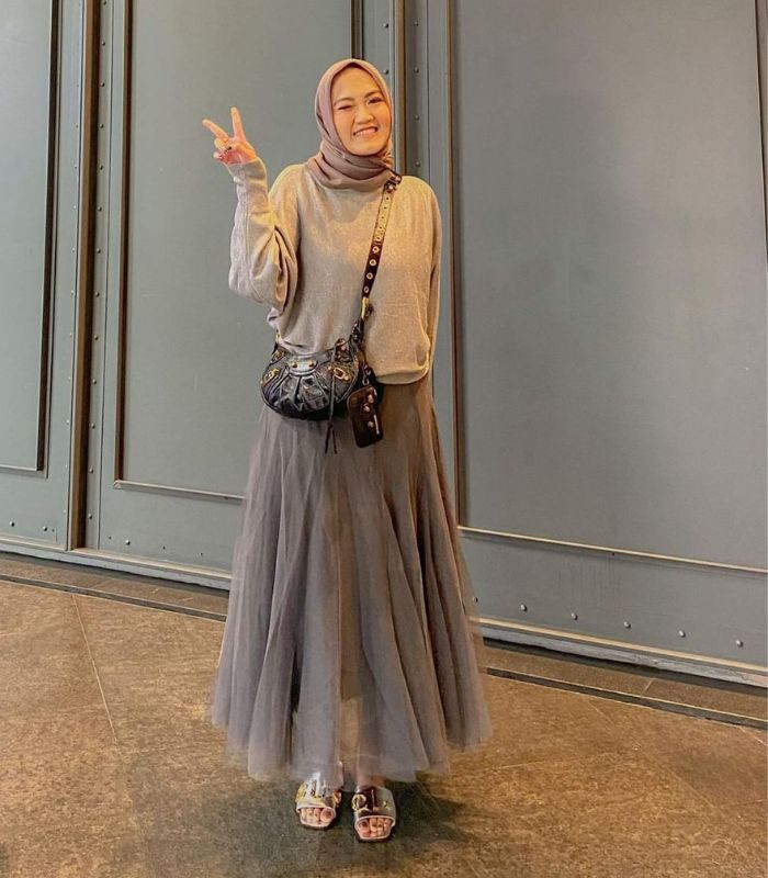 10. Terakhir, Chacha tampil anggun yang menawan! Ia memadukan long sleeve t-shirt berwarna misty grey dengan rok tutu warna dark grey yang senada dengan hijab segi empat, tak lupa kenakan sling bag dan sandals yang senada, ya!