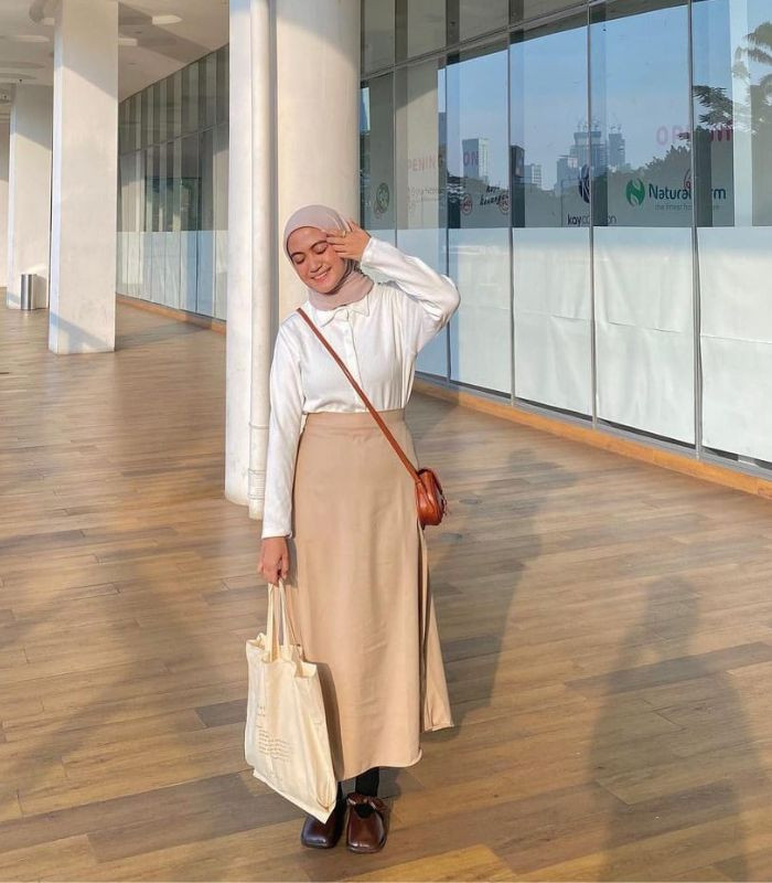 9. Outfit yang memberikan kesan nude kalem yang manis. Ia memadukan kemeja putih dengan maxi skirt berwarna cream serta hijab pashmina berwarna dusty pink, kenakan sling bag dan mule shoes berwarna coklat senada, bikin penampilan jadi makin all out!