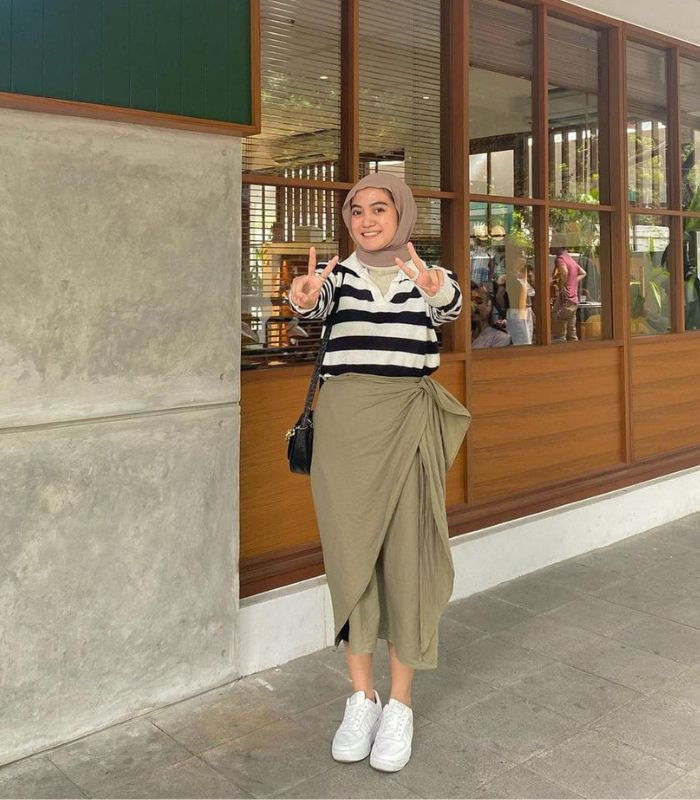10. Tampil dengan nuansa fresh look yang kalem ini. Perpaduan striped long sleeve t-shirt dengan rok lilit berwarna army dipadankan dengan hijab pashmina berwarna latte, tambahkan sling bag hitam dan sneakers putih bikin penampilanmu makin modis!