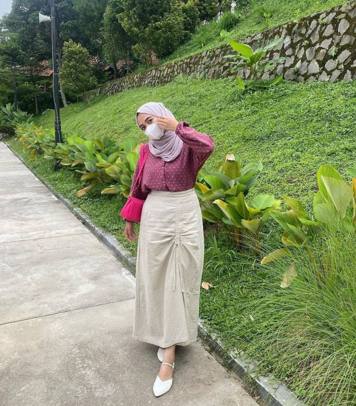 11. Padukan blouse ungu motif polkadot dengan straight skirt warna ivory bermodel serut dipadankan dengan hijab pashmina berwarna soft purple, tampil simple namun tetap terlihat fashionable!