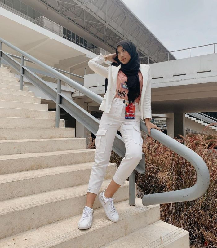 7. Mengenakan outfit berwarna serba putih berupa outer blazer, cargo pants dan sneakers kemudian ditambah inner kaus warna peach serta hijab pashmina hitam, cocok untuk acara semi formal.