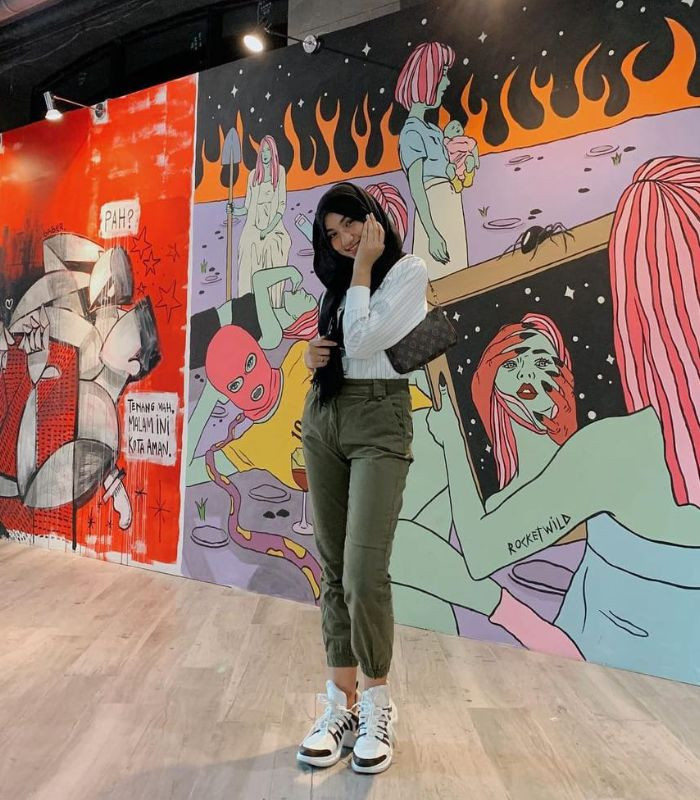 9. Memadukan kemeja striped sleeve putih dengan jogger pants army serta hijab pashmina hitam, tambahkan sneakers putih dan hand bag andalan, bikin outfit makin terkesan kekinian abis!