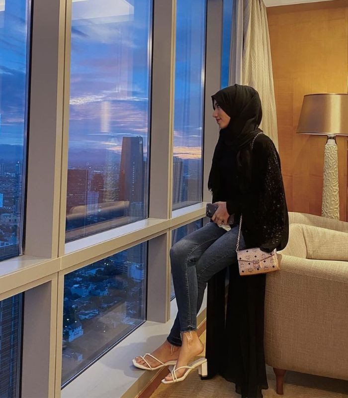 10. Terakhir, Darin menggabungkan outfit warna serba hitam yang terdiri dari inner manset dibalut outer brukat serta hijab pashmina dipadankan dengan slim-fit jeans dan strap heels putih, bikin penampilannya jadi makin modis!