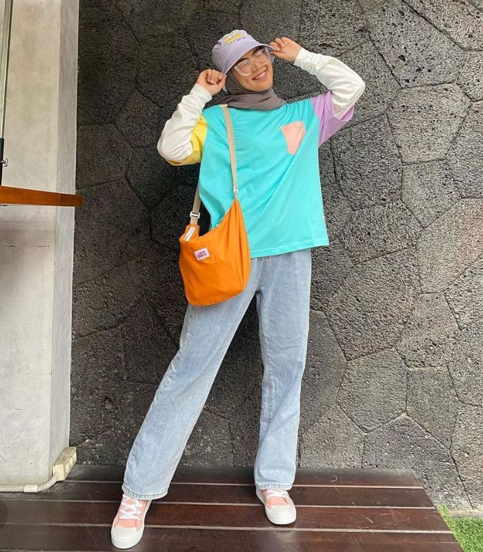 1. Padukan manset putih dibalut kaus tiga tone warna pastel yang cerah dipadankan dengan celana jeans serta hijab pashmina abu-abu, tambahkan bucket hat dan sneakers berwarna cerah. Tampil stylish kekinian, outfit yang cocok untuk hangout santai.
