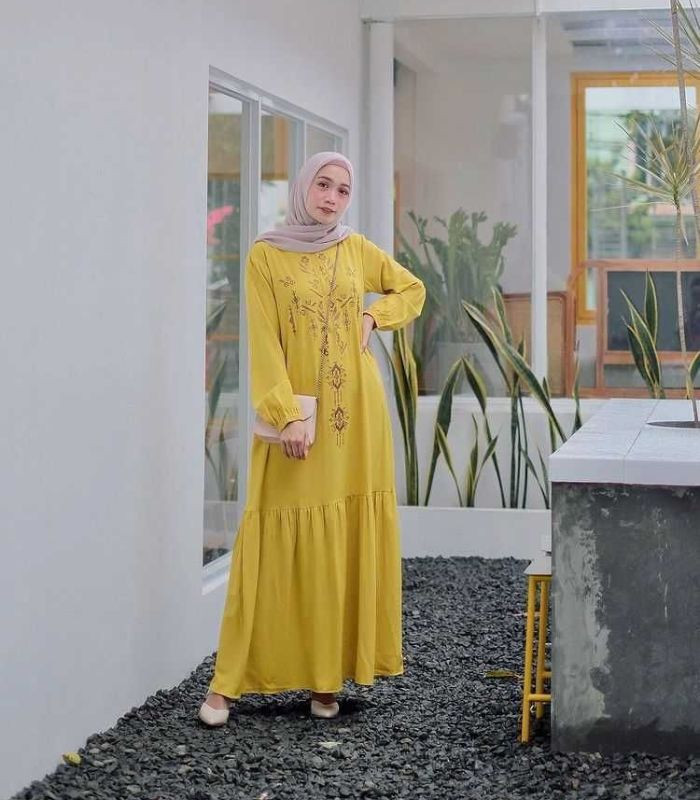 6. Tampilan elegan yang memberikan kesan feminin. Uwie memakai yellow dress ini dengan detail bordiran di bagian depannya dan tambahan aksen ruffle dibagian bawahnya dipadukan dengan hijab segi empat berwarna baby pink. Terlihat simple namun terkesan cantik ketika dipakai.