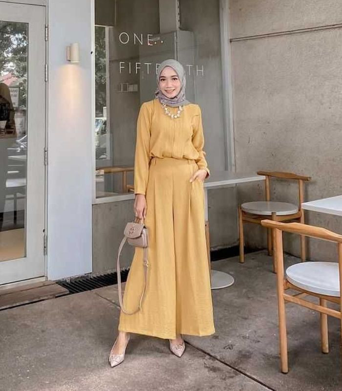8. Gunakan one set berupa blouse dan celana kulot berwarna soft yellow dipadukan dengan hijab segi empat abu-abu, tambahkan aksesori kalung sebagai statement point pada outfit, bikin tampilan jadi lebih jenjang dan kece abis!