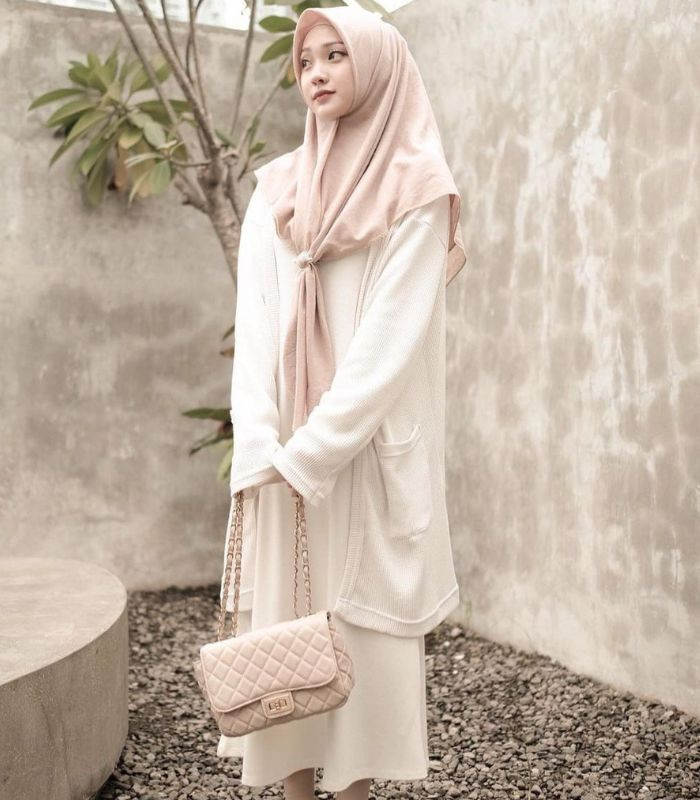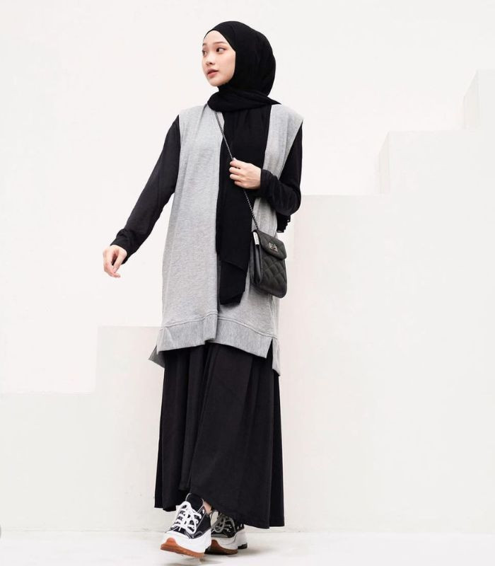 10. Terakhir, Julia menggabungkan basic dress hitam yang senada dengan hijab pashmina kemudian dibalut long vest abu-abu, kenakan sling bag dan sneakers berwarna senada agar tampilan makin terlihat stand out yang kece!
