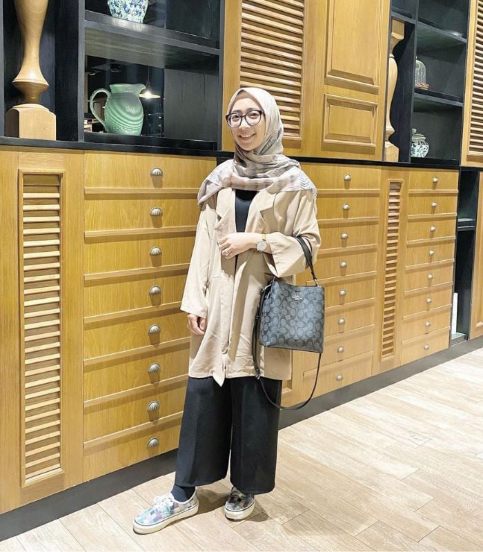 1. Perpaduan inner hitam yang senada dengan celana kulot dilapisi blazer berwarna coksu serta printed hijab segi empat yang tampak serasi dengan outfit, ditambah hand bag dan canvas shoes, jadi makin tampil modis kekinian.