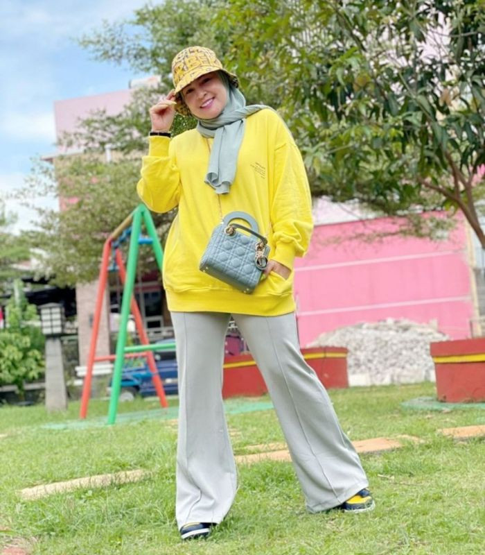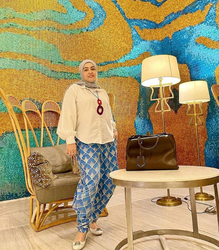 4. Penampilan dengan gaya casual yang terkesan elegan. Astrid memadukan oversized kemeja putih dengan pants biru bermotif serta hijab pashmina warna light grey, kenakan aksesori kalung dan flat shoes putih sebagai statement point pada outfit-mu.