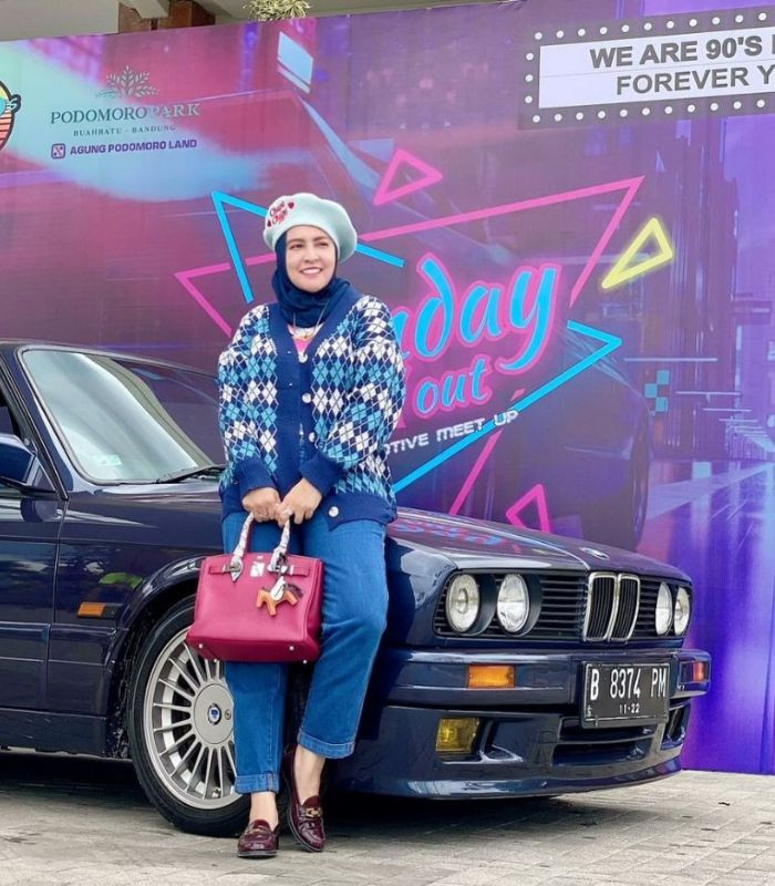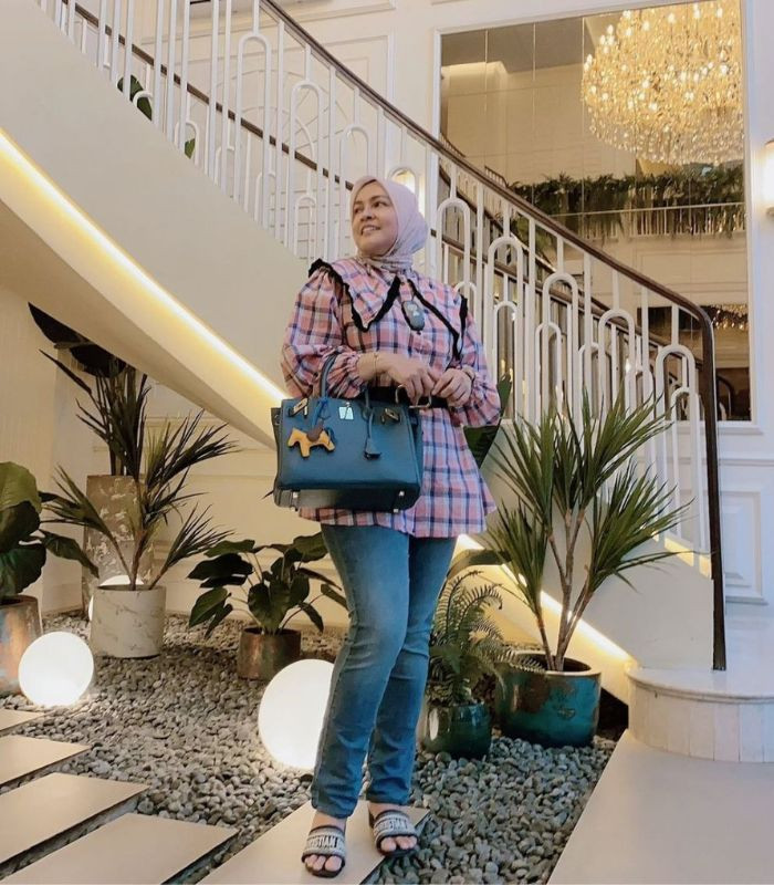 5. Outfit yang cocok dikenakan untuk acara semi formal yang terlihat anggun. Gunakan big collar shirt motif kotak-kotak dengan celana jeans serta hijab segi empat warna baby pink, lengkapi dengan hand bag dan sandals berwarna netral biar makin stylish.