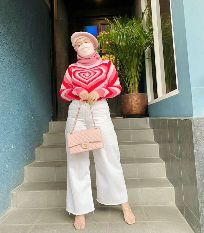 7. Tampil eye catchy yang terkesan girly abis! Gunakan long sleeve t-shirt motif love berwarna merah muda menyala dipadukan dengan celana kulot jeans putih serta hijab segi empat pink, gunakan baret hat, shoulder bag dan heels berwarna dusty pink yang senada.