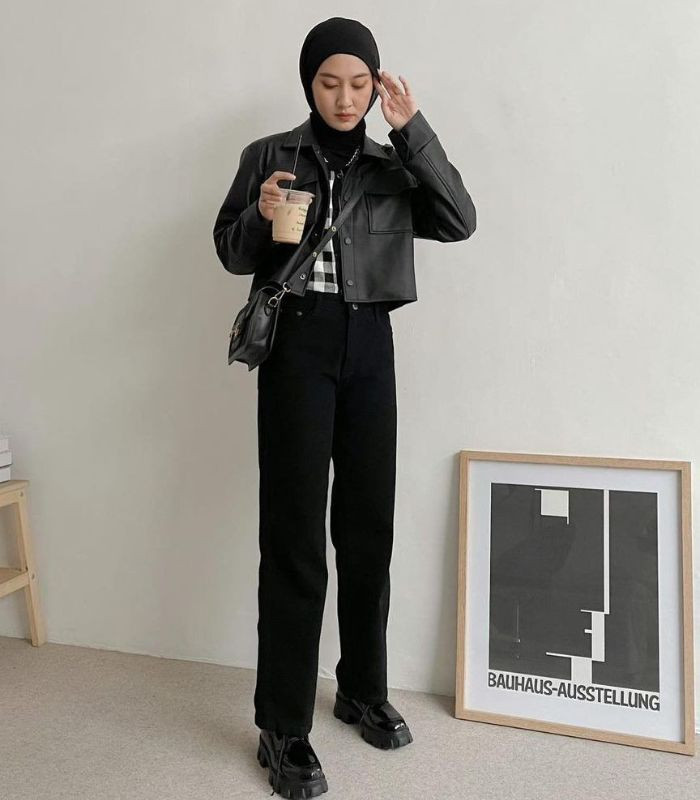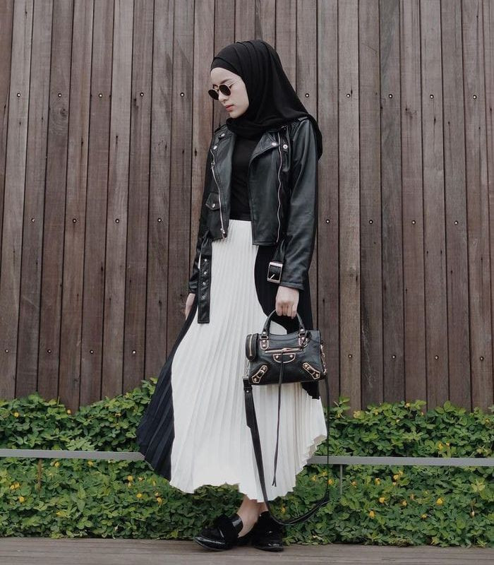 4. Tampil sedikit boyish style yang terkesan anggun! Kombinasikan inner dibalut crop jaket kulit dan hijab pashmina berwarna hitam senada dipadankan dengan rok plisket kombinasi warna monokrom yang unik, ditambah sling bag dan mules shoes berwarna senada bisa jadi pemanis gaya!