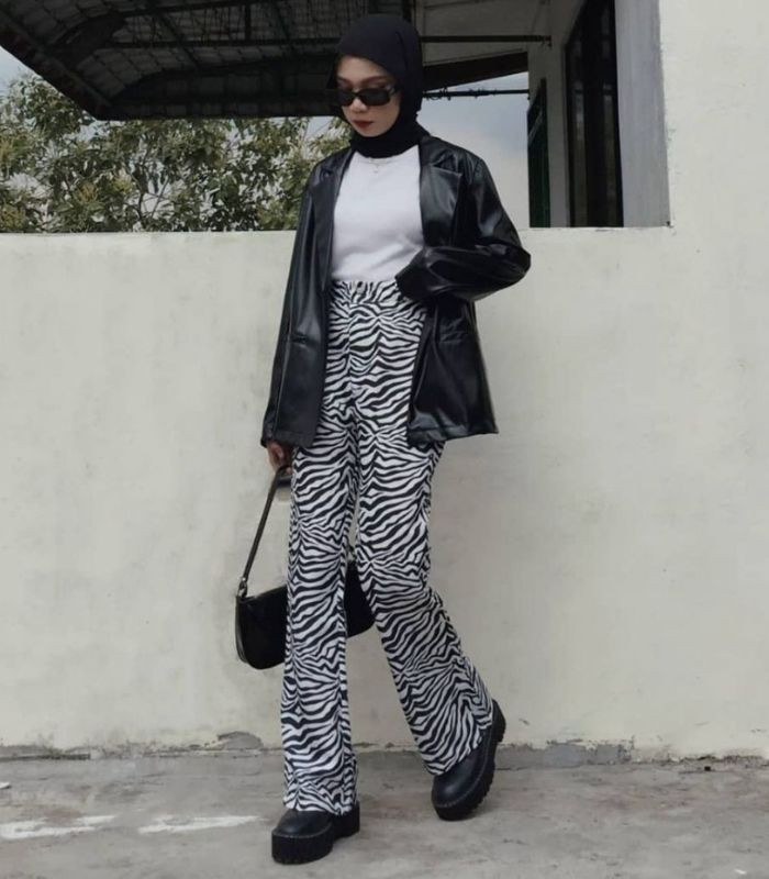 3. Penampilan jadi lebih chic dengan memadukan inner putih dilapisi dengan jaket kulit yang edgy dipadankan dengan highwaisted straight pants bermotif animal print monokrom tak lupa hijab pashmina, shoulder bag, dan boots berwarna serba hitam, bikin tampilanmu makin stand out!