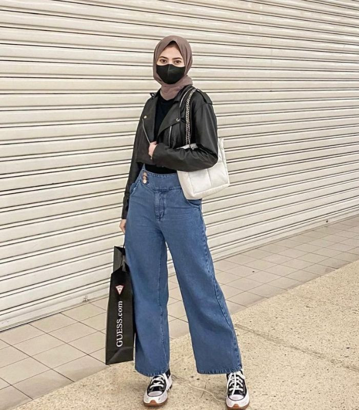 5. Outfit yang cocok bagi si pecinta anti ribet, dengan mencoba kenakan inner hitam yang senada dengan jaket kulit model crop dipadukan dengan celana kulot jeans serta hijab pashmina berwarna cokelat. Makin terlihat casual dengan menggunakan sneakers!