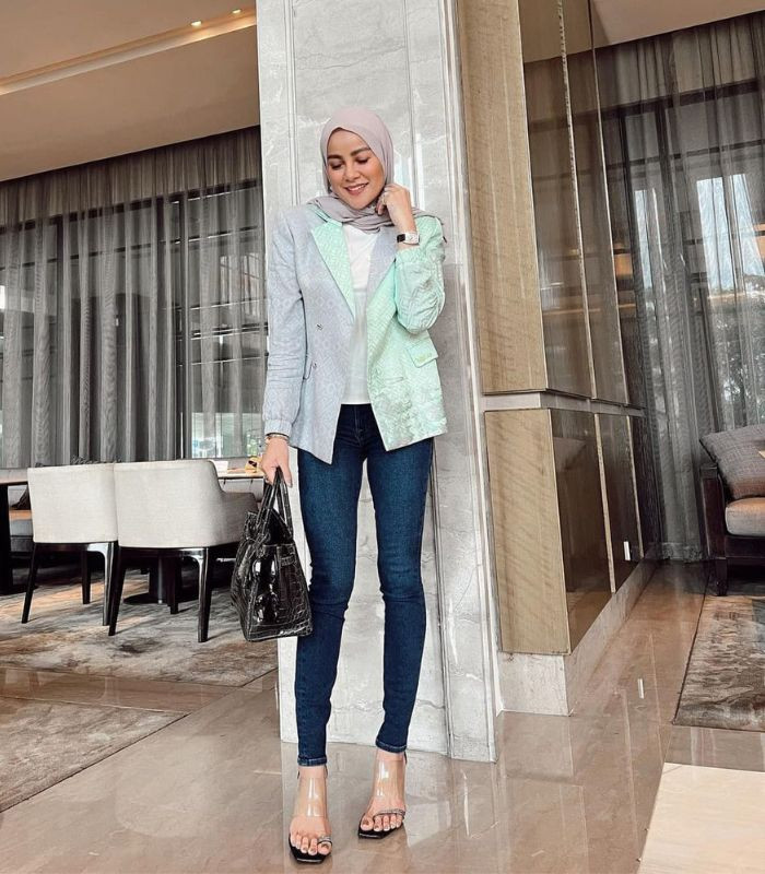 2. Mengusung nuansa warna pastel dengan memadukan basic tee putih dibalut blazer kombinasi warna light grey dan mint green dipadankan dengan slim-fit jeans serta hijab pashmina berwarna light grey, bikin makin tampil casual dengan kenakan heels dan hand bag hitam yang senada.