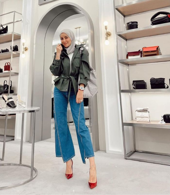 3. Tampil stylish yang memberikan kesan bak lady boss! Olla memilih basic tee putih dibalut jaket berwarna army dikombinasikan dengan cutbray jeans serta hijab pashmina berwarna light grey yang senada dengan shoulder bag, berikan statement point pada outfit gunakan pointed toe stiletto warna merah menyala.