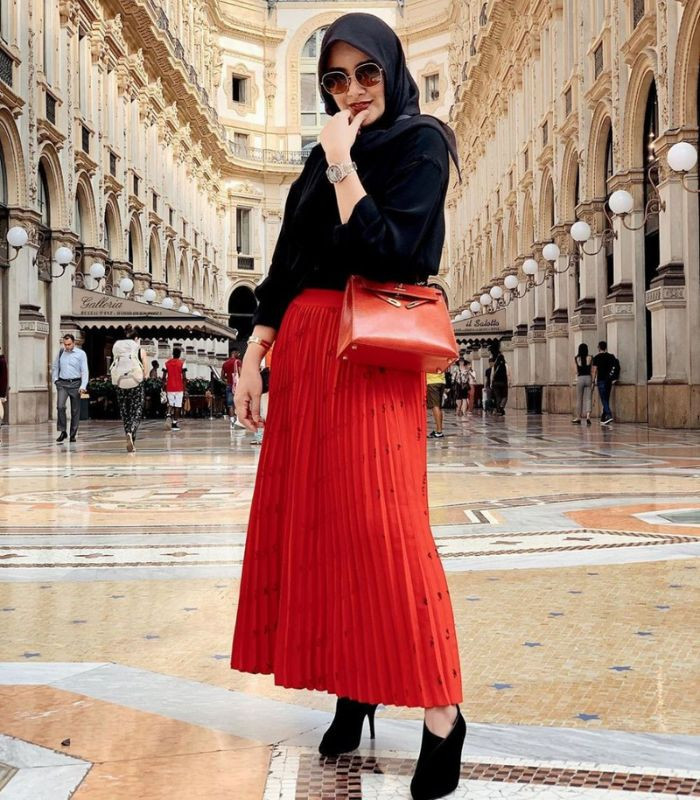 4. Tampil anggun yang memberikan kesan eye-catching! Padukan atasan loose shirt warna hitam yang senada dengan hijab segi empat dipadankan dengan pleated skirt berwarna merah menyala tampak matching dengan sling bag, ditambah pointed toe boots hitam sebagai statement point yang manis!