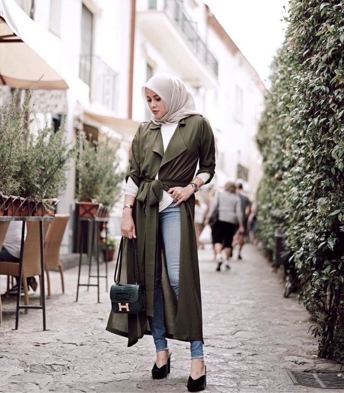 5. Mengombinasikan inner warna putih dibalut long wrap outer berwarna army dengan celana jeans dipadankan dengan hijab segi empat berwarna sand beige, gayanya tampak eye-catching yang terkesan modis banget!