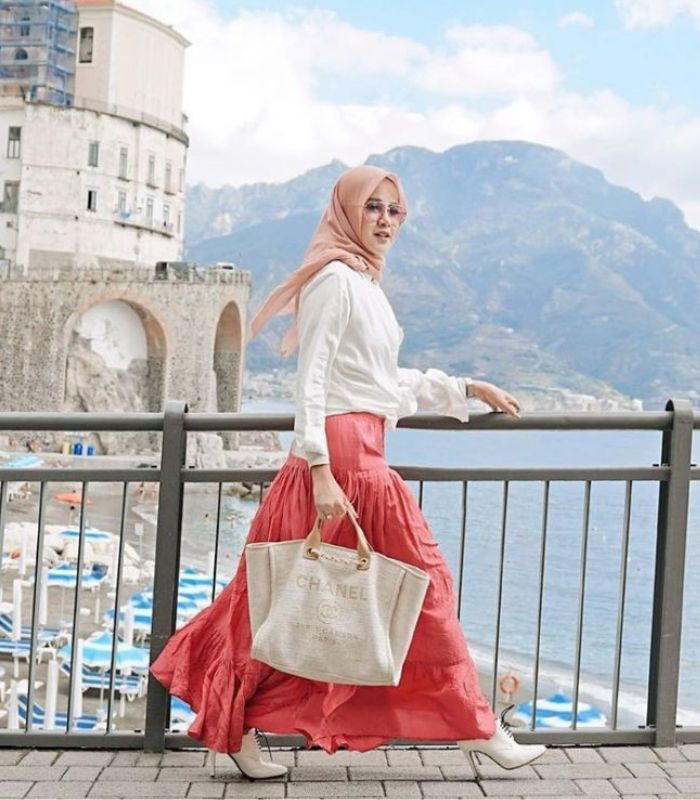 6. Olla memadukan blouse warna putih dengan bawahan plain skirt bentuk A-line berwarna pink coral serta hijab segi empat berwarna dusty pink, ditambah hand bag dan pointed toe boots berwarna putih yang tampak serasi, tampil feminin look yang memberikan kesan menawan!
