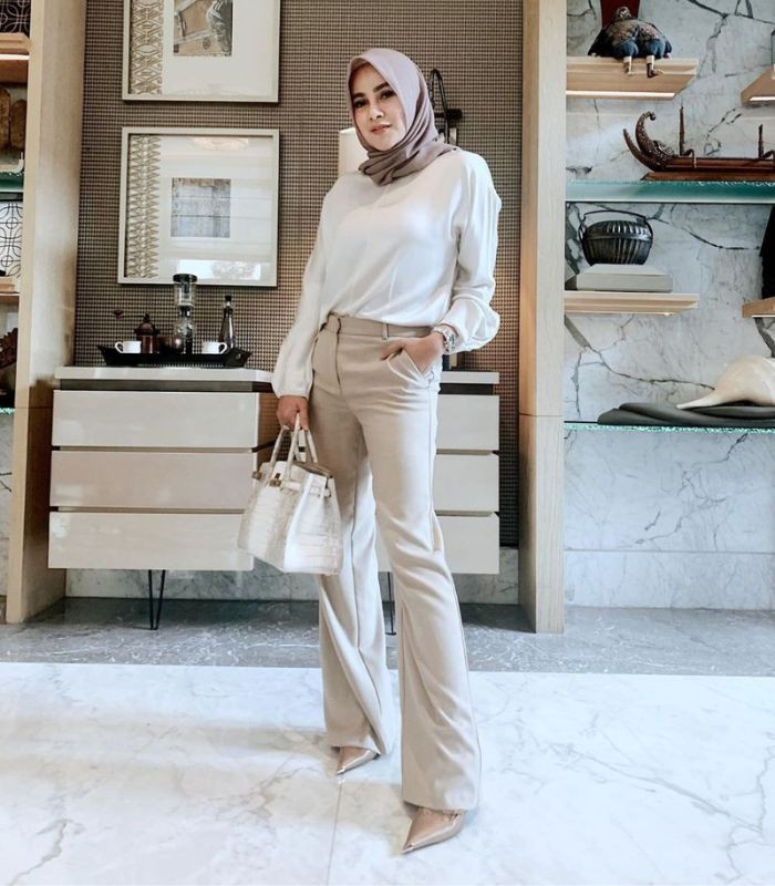 7. Penampilan yang terkesan menawan dengan nuansa warna nude yang terlihat manis! Memadukan blouse putih dengan flare pants berwarna beige serta tak lupa pilih hijab segi empat berwarna mocha, Olla menambahkan pointed toe stiletto heels dan hand bag untuk menyempurnakan outfit.
