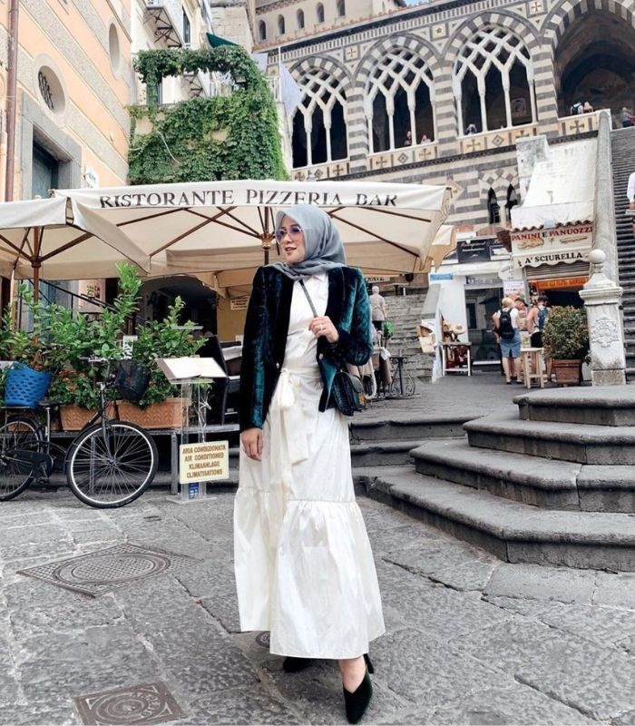 8. Outfit satu ini Olla memilih kenakan dress bernuansa putih dibalut blazer warna emerald serta hijab segi empat warna abu-abu, ditambah sling bag dan heels berwarna hitam senada. Bikin penampilan makin terlihat stunning!