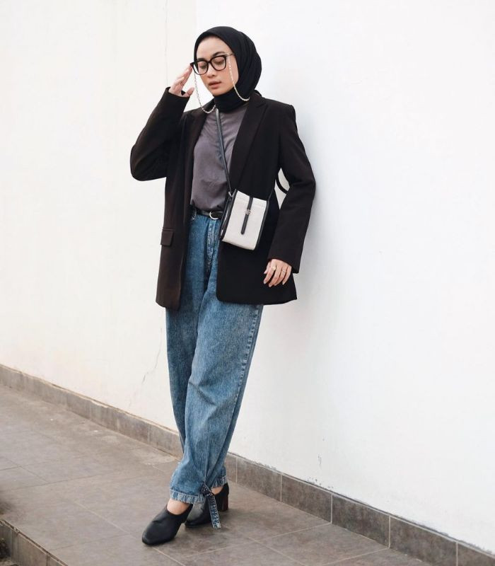 1. Memadukan basic tee abu-abu dibalut suit blazer warna hitam yang senada dengan hijab pashmina dipadankan dengan jogger pants jeans serta kitten heels, bikin penampilanmu makin stand out yang modis!